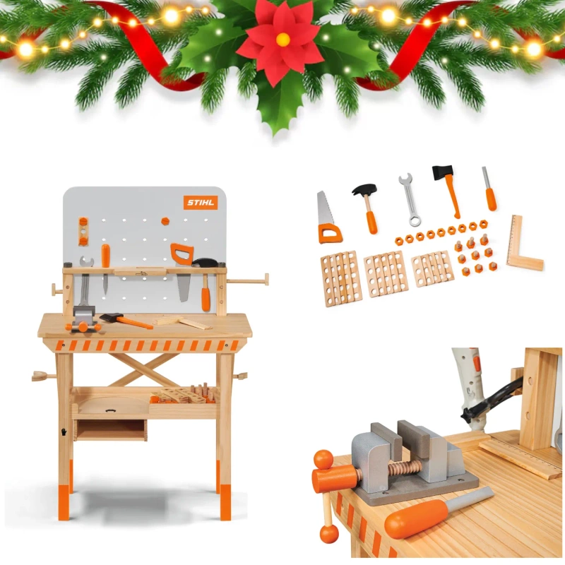 - Wyposażenie: Drewniane narzędzia, uchwyty na urządzenia STIHL dla dzieci